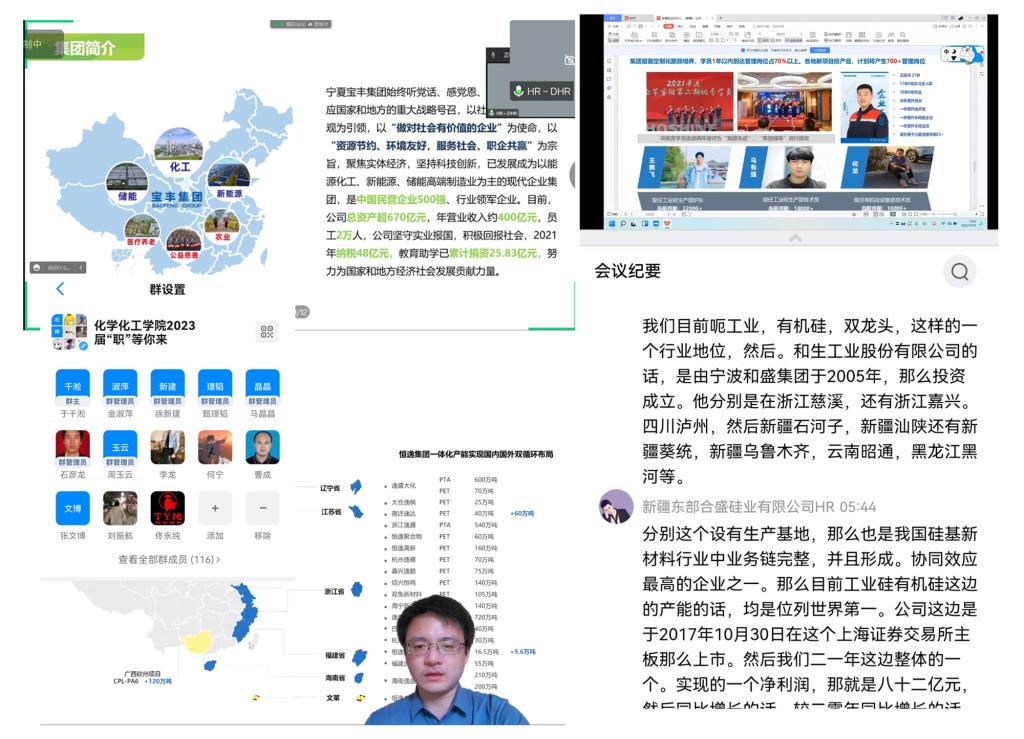 本次招聘会优选了9家企业通过网络视频与毕业生、老师进行线上交流,提供了化工类岗位60多个,覆盖新能源、新材料、能源化工、储能、生物制药等领域,其中包括浙江恒逸、新疆中泰、合盛硅业、宁夏宝丰、广汇能源等知名企业。