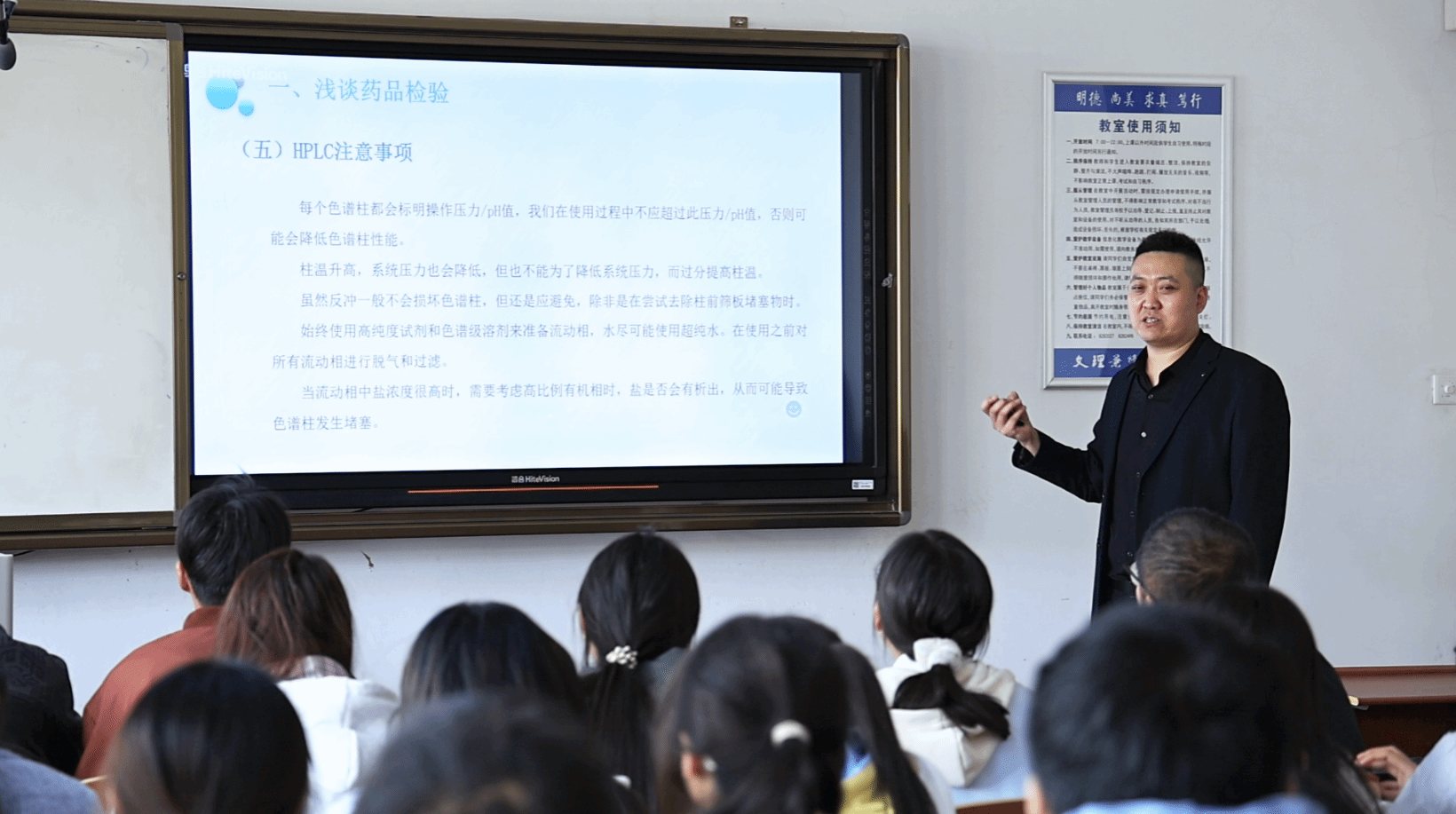 4月20日,太阳成tyc122cc集团特邀张掖市质量检验检测研究院药品检验检测中心副主任王昭国、食品检验检测中心副主任于喆源两位专家,为化学专业(分析检验方向)222班员工开展“药物分析与食品分析”专题授课。