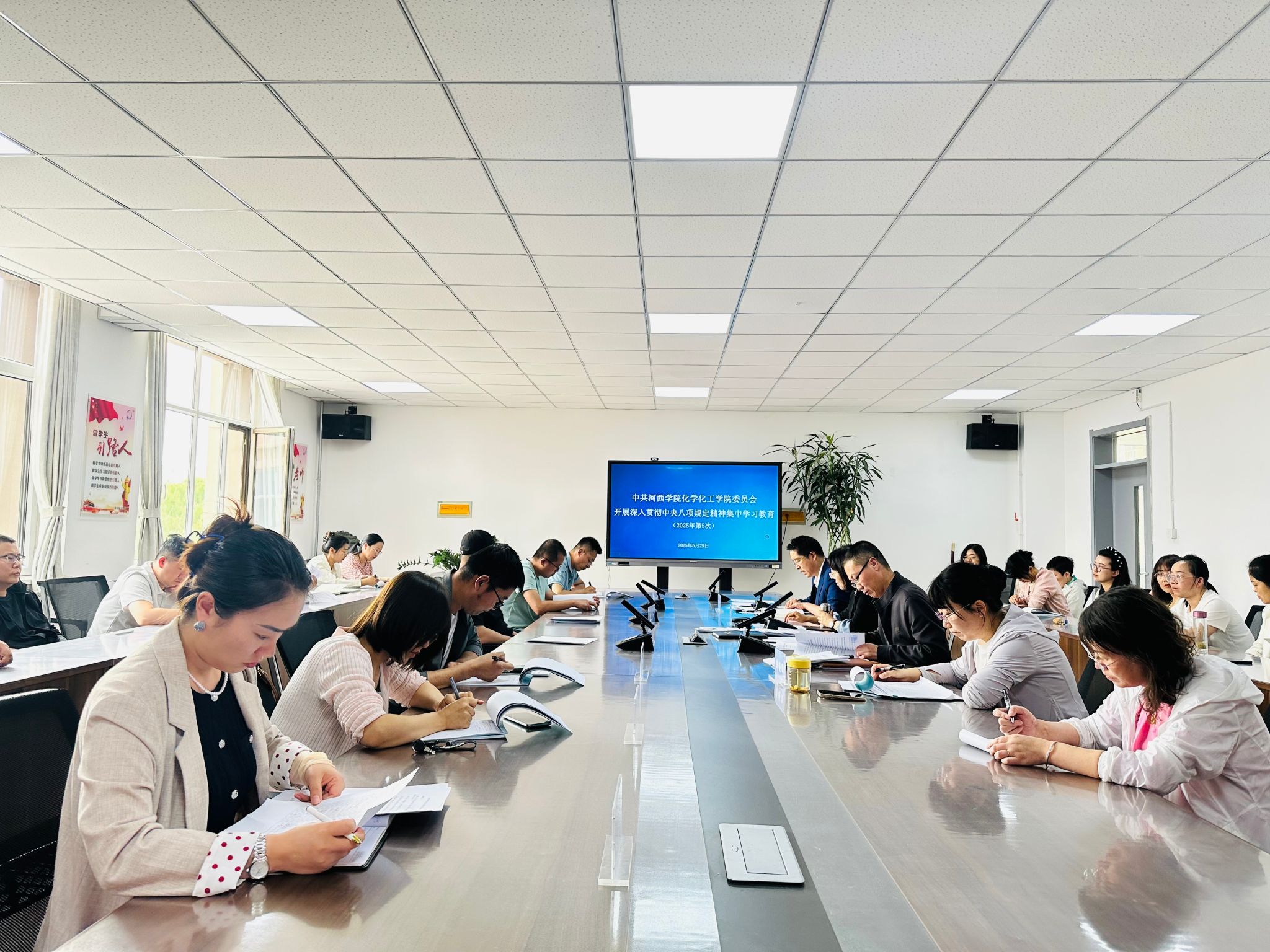 会上学习了《习近平关于加强党的作风建设论述摘编》中“使党的作风全面纯洁起来,以优良党风带动社风民风向上向善”“推进作风建设常态化长效化”等内容;学习了中央党的建设工作领导小组《党的十八大以来深入贯彻中央八项规定精神的成效和经验》《中央八项规定改变中国》;通报了《甘肃省违反中央八项规定及其实施细则精神典型案例》;传达了《关于进一步规范差旅费报销管理的通知》《关于教职工差旅费报销相关问题的补充规定》文件精神;并以《套取科研经费和违规使用科研经费典型案例》开展了以案说纪教育。